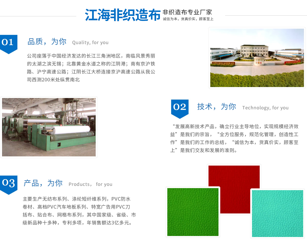 江海企業(yè)有江陰市江海非織造有限公司、江陰市江海防水材料有限公司、江陰市三江寬幅無(wú)紡布有限公司、江陰市三江織物涂層新材料有限公司組成,均屬于江蘇省民營(yíng)科技企業(yè)。企業(yè)現(xiàn)擁有員工近千名,占地15萬(wàn)平方米,廠房建筑面積達(dá)80000多平方米,凈資產(chǎn)超億元,主要生產(chǎn)無(wú)紡布系列、滌綸短纖維系列、PVC防水卷材、高檔PVC汽車地板系列、特寬廣告用PVC刀括布、貼合布、網(wǎng)格布系列,其中國(guó)家級(jí)、省級(jí)、市級(jí)新產(chǎn)品十多種,專利多項(xiàng),年銷售額達(dá)3億多元。